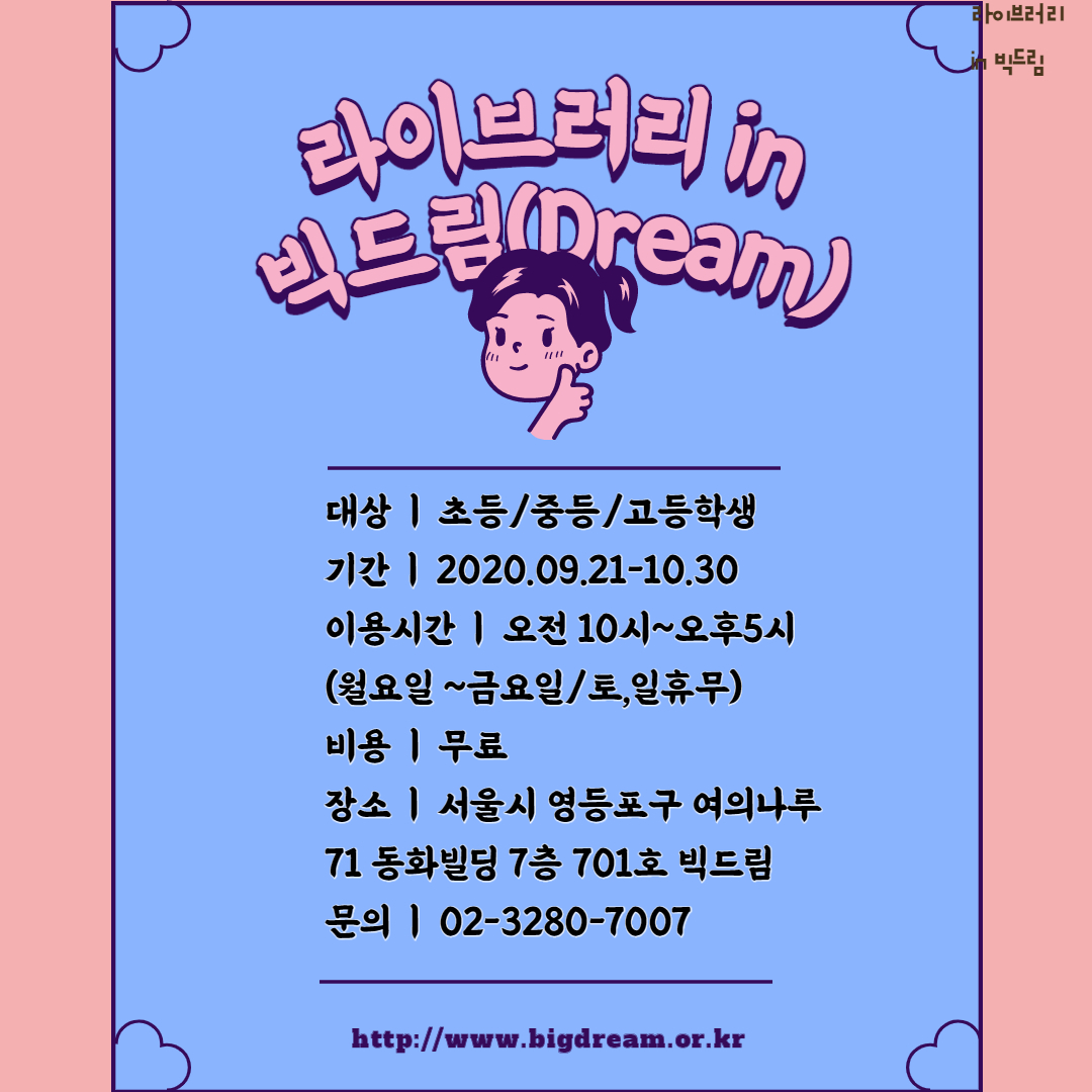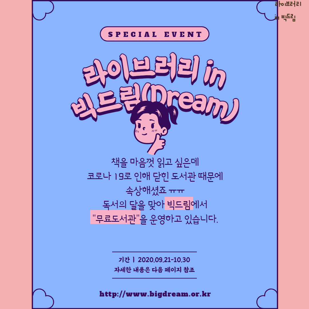 소통공감청소년에게 꿈과 희망을 위해 빅드림이 함께합니다.Home공지사항공지사항빅드림 독서프로그램 안내 청소년 대상 ‘무료도서관’ 개방작성자빅드림작성일2025-06-27 16:21조회54 좋아요 0 싫어요 0 인쇄 « 다문화가정 아동청소년 학습 및 멘토링 체험 안내문 (사) 빅드림 6~8월 나눔소식지 » 목록보기 Powered by KBoard